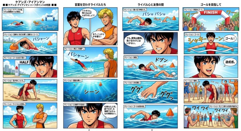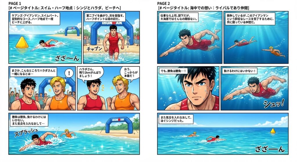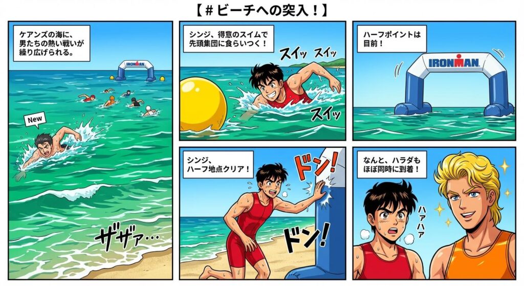 「ハラダさん、残り2kmがんばりましょう!」シンジはハラダに声をかけ、また海に飛び込む。