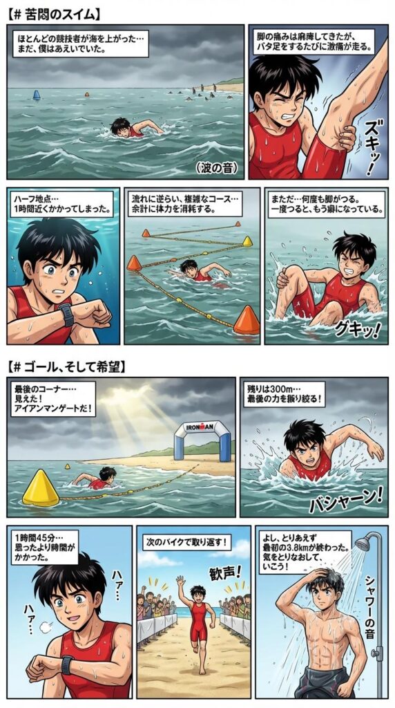 ただ、ただでさえ遅い泳ぎが、その3割を奪われ、時々激痛に苛まれながらのスイムでは、実力が出せるものでもない。