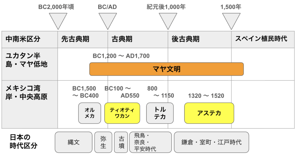 そして中米メキシコ付近では、紀元前1,200年頃からマヤ文明がユカタン半島を中心に栄えた。