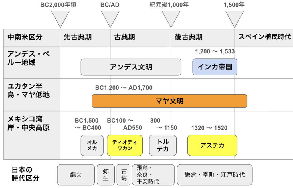 僕も含め、インカやマヤと言うと、鎌倉時代の次は室町時代のように、一つの場所の文明の遍歴と思っている人は多いと思う。実際は地図中のように、広く中南米に渡る地域の、それぞれ別々に発展した文明だ。発生した時期や歴史の古さも地域によって異なる。