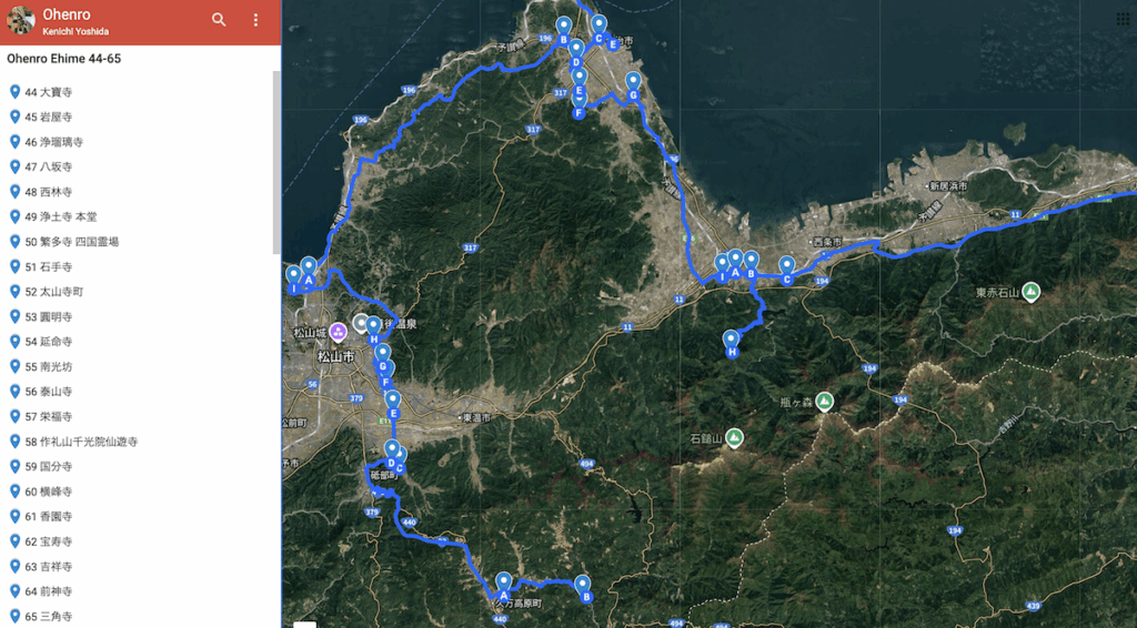 それではお遍路巡りを始めます。愛媛の霊場は、菩提の道場と呼ばれ、四十四番の大寶寺から六十五番の三角寺までの22道場があります。