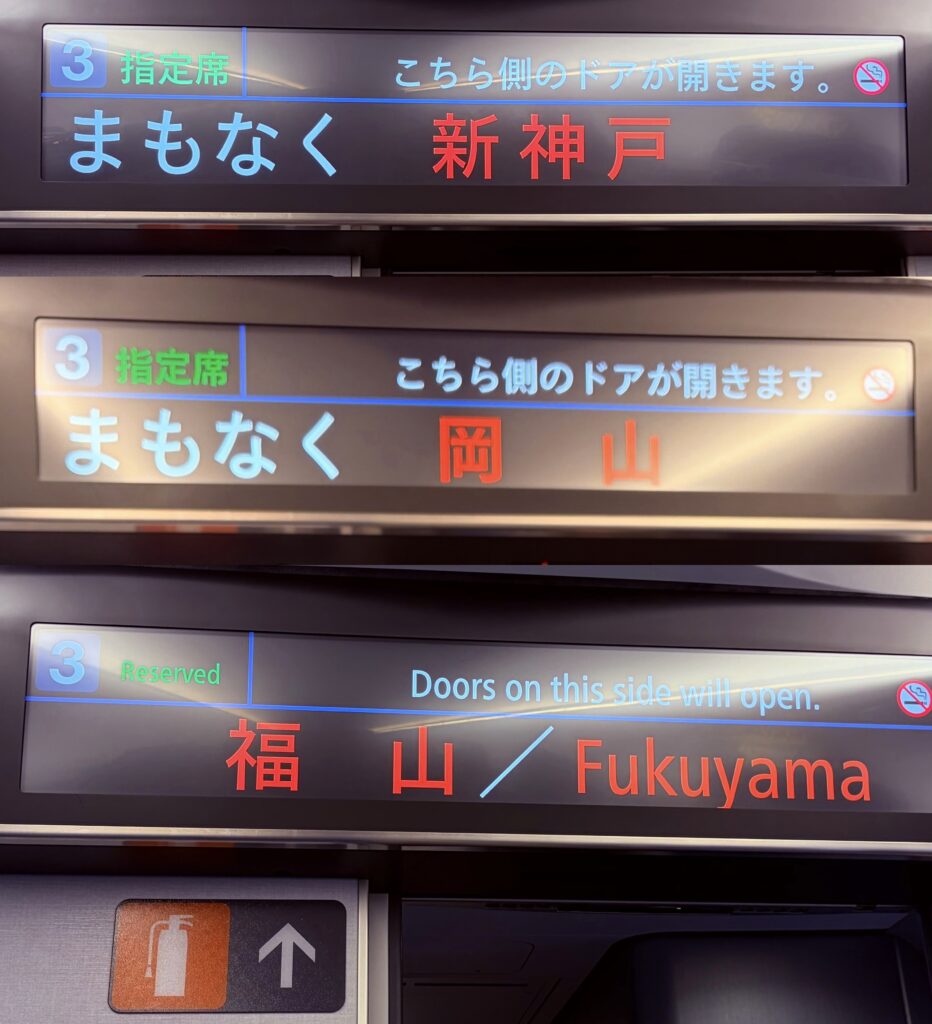 まずは東京駅をたって、広島県の福山まで行きます。新幹線のぞみで、福山まで3時間半です。