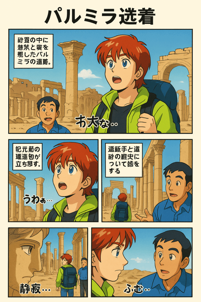 そして、砂漠の中に忽然と、列柱やローマ風建造物などの遺跡群が姿を現す。パルミラだ。