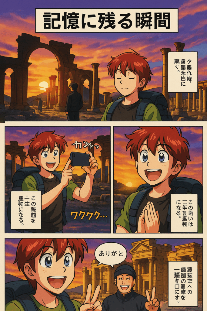 幸運なことにサソリとは遭遇しなかったが、パルミラの神殿と列柱の間から、砂漠の壮大な夕日を眺めた。