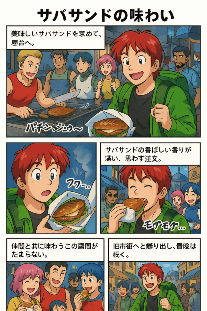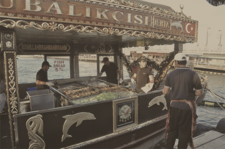 ガラタ橋の袂で、小さな船が何艘もあり、そこからサバサンドを売っている。釣竿でサバを釣りながら、そこで揚げてる。小さな船なので無茶苦茶揺れてる。