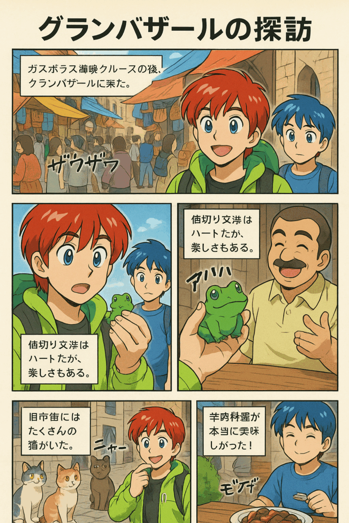 さんざん探し回った挙句僕は、ターコイズ(トルコ石)でできたという小さなカエル(?)をゲット。なぜ?と自分でも思うが、東西を行き来して何故かここにいるカエルが、買って欲しげにこちらを眺めていた気がするから。トルコのおっちゃんとの値切り交渉はハードながらも楽しかった。