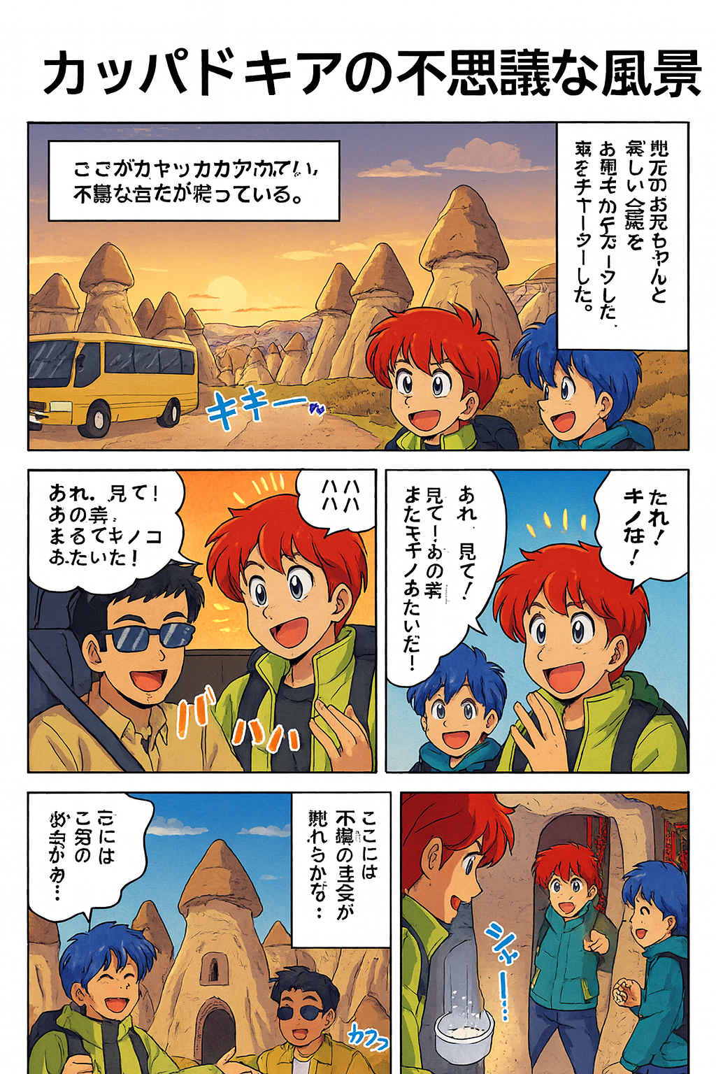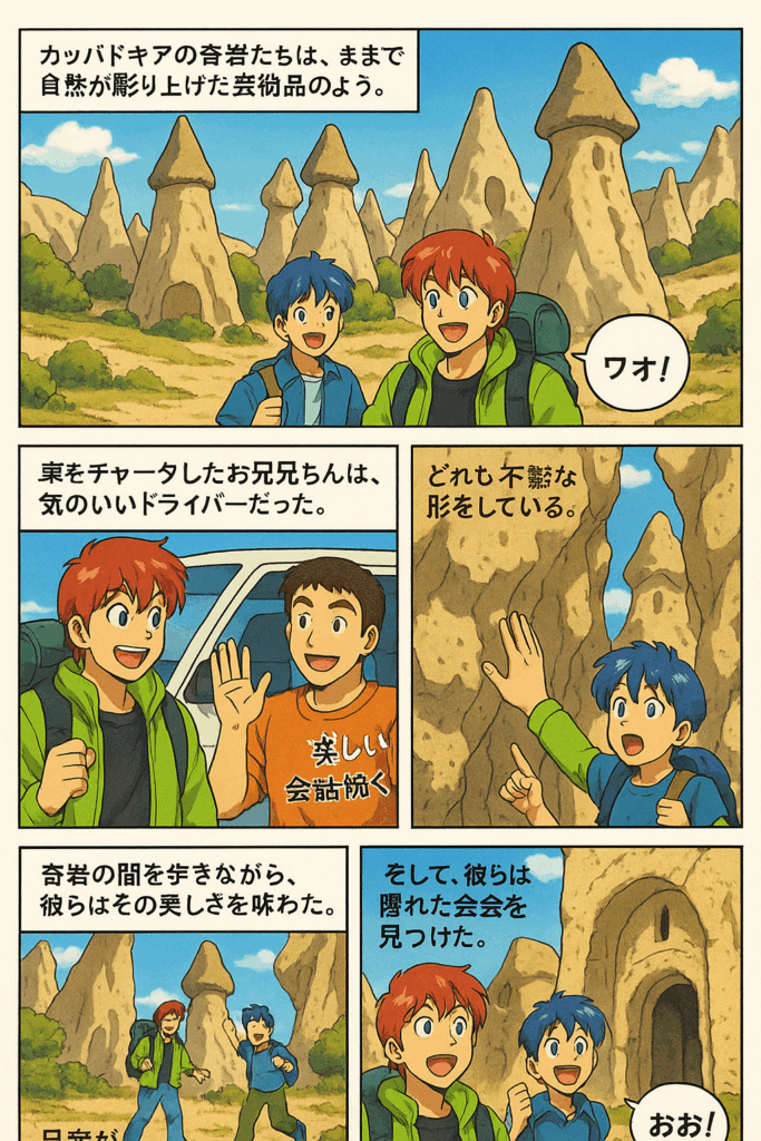 ニョキニョキ不思議な岩が広がるカッパドキア。ここで気球に乗るとその全貌が見えるのだが、もちろんそんなお金は無いので、近くにいたお兄ちゃんたちと交渉して、車を一日チャーターして、カッパドキアの奇岩巡りに出発。