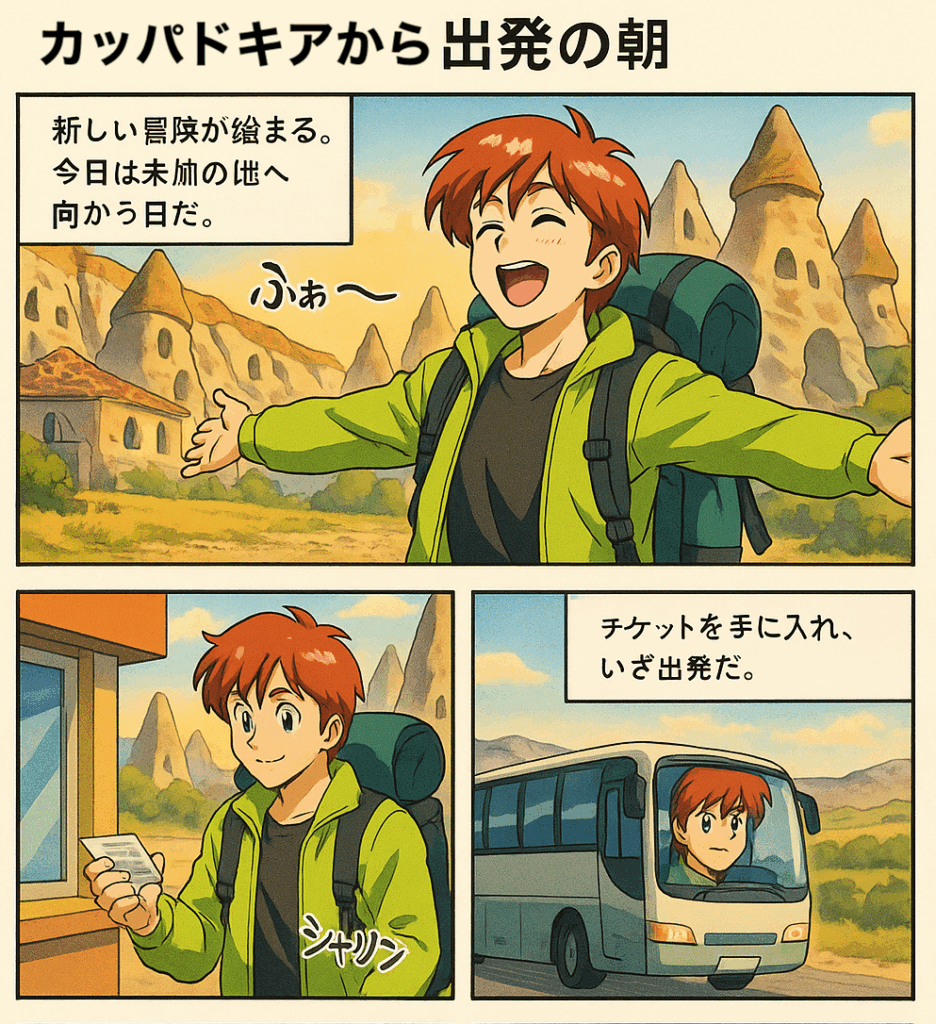 深い眠りに落ち、幾つかの夢を見たような気もするが、朝起きて奇岩ホテルを出る。そしてカッパドキアを立って、バスで南下する。